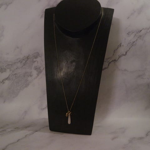 Hals-smykke. Blankt. Ikke sølv men ser ut som sølv. Mange fine detaljer. Hjerter. Anker. Stener mm. Total lengde 70 cm.