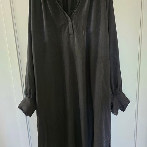 Selger en klassisk svart kjole i str. XL. Den har pent mønster i stoffet. Mål: 53 cm i tverrmål målt under armene og 94 cm lang.