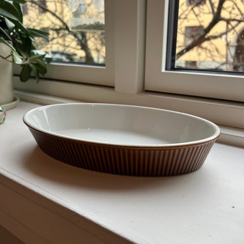 1. Oval ildfast form, 37,5 x 24,5 cm, høyde=6,5 cm, 1100,-