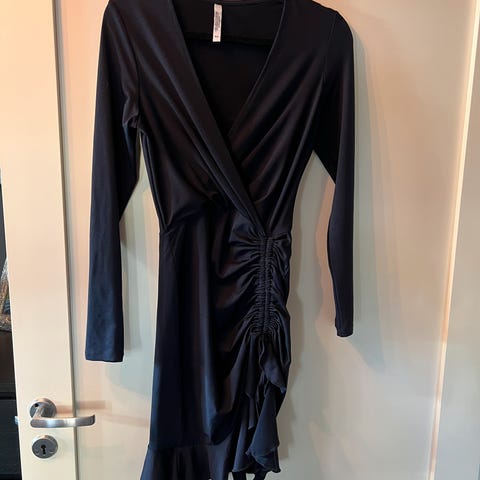 Kjolen er meget pen. Innsvinget kort kjole i deilig myk tynn fløyel. Meget pen. Ikke foret. Noe elastisk. Trolig polyester (tag klippet av). Størrelse XS. Trekkes over hodet. Lengde fra overkant skulder til skjørtekant ca 87 cm. Omkrets under armer ca 70-80 cm, liv ca 55-60 cm. PS! Kjolen er egentlig for liten til prøvedukken. Billigste porto. Se også mine øvrige annonser (trykk min profil for å se annonsene).