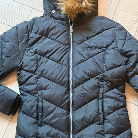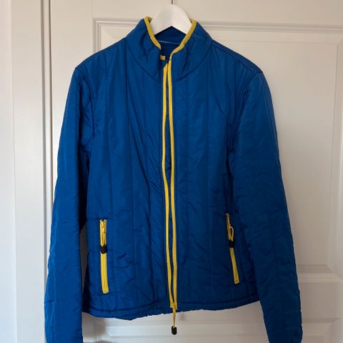 Selger en mørk lilla vattert jakke, str 170, for 299 kr.