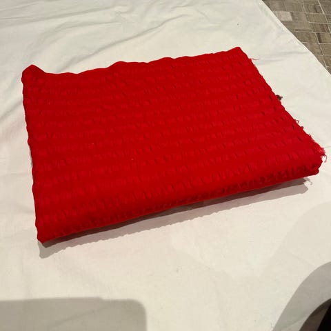 Metervare i 100% bomull i juledesign og grytekluter. Ubrukt. Se mål på bildene, bredde x lengde. Farven rød kommer frem mer gul enn i virkeligheten. Fin julerød farve. Pris for hele pakken.