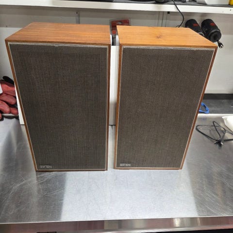 Selger noen gamle høyttalere. Har ikke info om disse men fungerte sist de var i bruk. Kan eventuelt brukes som stilig retro pynt