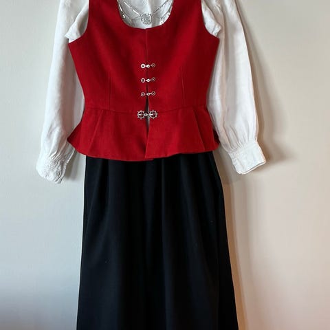 Brukt en gang, fremstår som ny. . Flotte farger kongeblå og asparges grønn i kontrast. Selges med tilhørende smykke. Kjøpt på Husfliden for noen år siden. Det står S på størrelsen, men vil si at grunnet fasongen kan den også passe M og L.