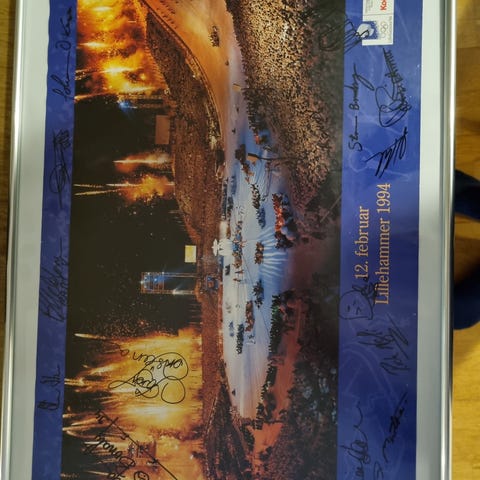 Sjeldent bilde fra ol 94 på Lillehammer. Det er stiftet på en papp plate, men fortjener en fin ramme. Et must for hytta. Har også et stort løypekart/oversikt over Lillehammer 94. Dette er helt nytt og uåpnet. Selges 400kr pr.stk. kan bytte i Kjell Aukrust og flåklypa. Et must på hytta i Hafjell eller Kvitfjell