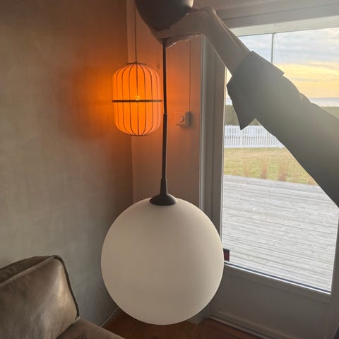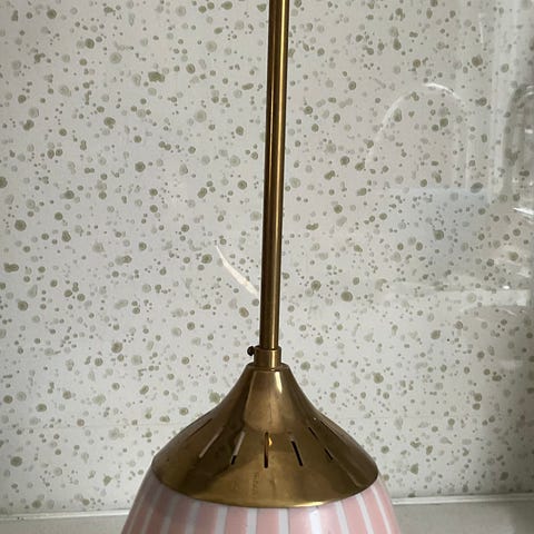 Tøff vintage lampe i veldig fin stand fra 50 - 70 tall. Denne er muligens laget av T. Røste & Co. Har samme komponenter som en annen lampe jeg har fra det firmaet. Den gir ett veldig spesielt lys, med prismer på sidene samtidig som den sender bra med lys rett ned. Ledning er byttet og kan reguleres etter eget ønske. Størrelsen på lampen er ca 22 cm i høyden og 13 cm i diameter. Perfekt til soverom eller entre.