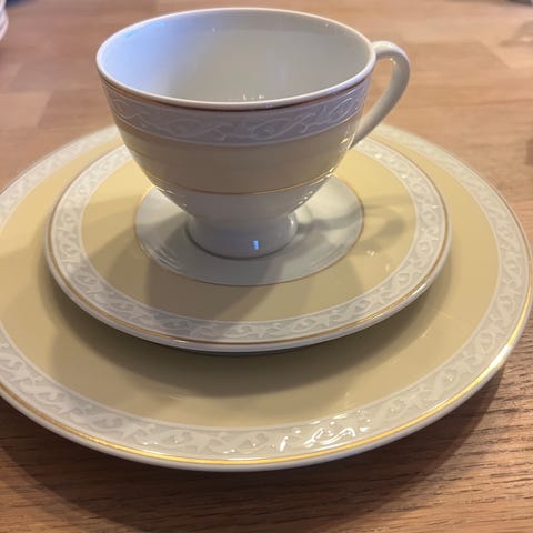 Retro picnic utstyr / camping servise i plast. 3 kopper og 3 asjetter i brun farge.