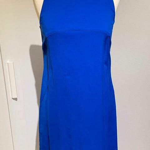Nydelig, ettersittende med strech. Skinndetaljer og lekker kongeblå/ lilla ish kjole. Brukt en gang.