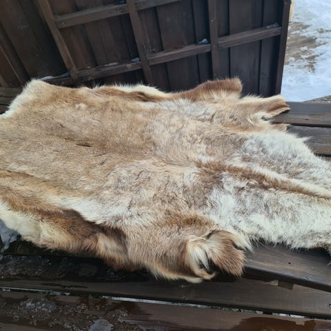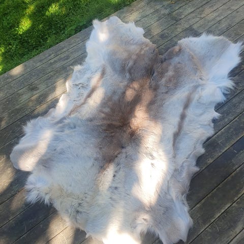 Selger ett flott og ubeskadiget Reinskinn. Skinnet har kun vært brukt til pryd på vegg Kan brukes til det meste. Pris i nærliggende butikk er kr 1399. Selger dette billig, Mål på dette flotte skinnet er , lengde 115 cm ,bredde 73 cm. Husk,nå blir det snart vinter og kaldt vær. Sikre dere e tt varmt reinskinn.