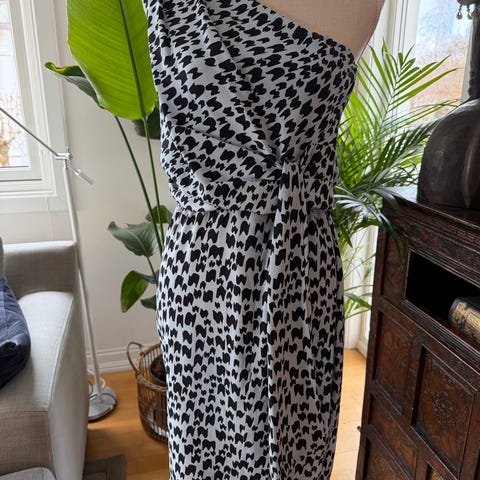 Kjole med innsvinget liv, fin detalj bak med gullbånd som knytes.