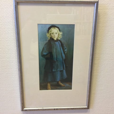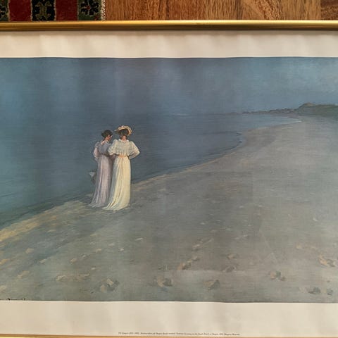 Trykk av Peder Severin Krøyers «Summer evening on the beach at Skagen». «The painter and his wife». 29 x 23,5 cm med S. Kroyer i gullskrift.