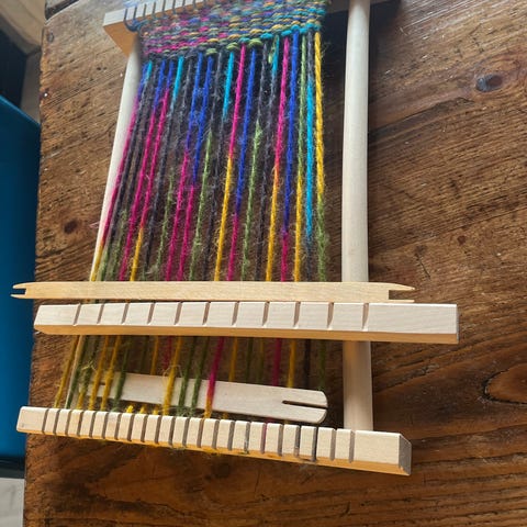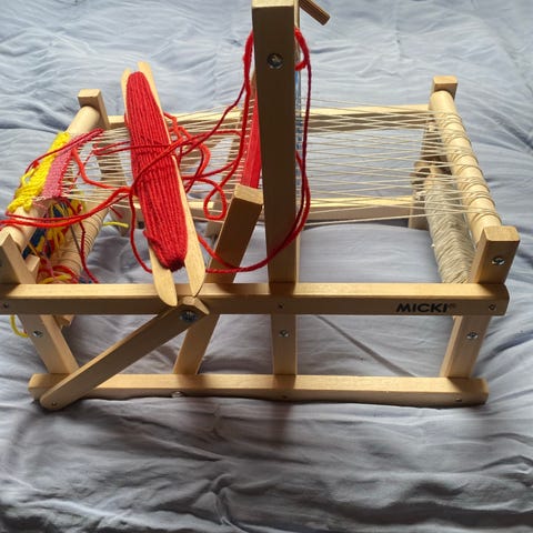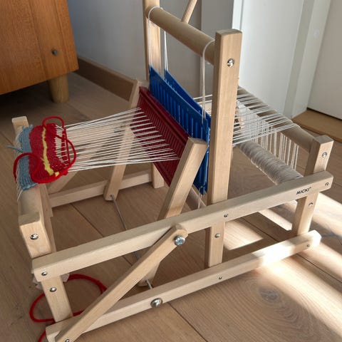 Den er gammel, fra 90-tallet, og den røde delen i plastikk er så sprø at den brakk under fotograferingen. Ellers er veven laget i solide materialer, typisk for Brio.