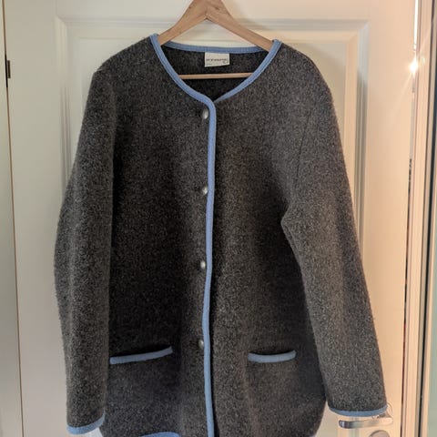 Pen, varmgrå mellomtykk ulljakke i 100% ull. Meget god kvalitet! Jakken er i Bia-design, str 40. Den har pene stikninger og 3 små forede lommer. Den er nesten ikke brukt - som ny!