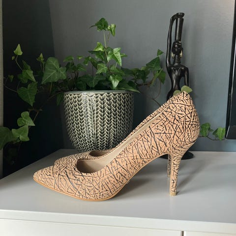 Semsket, nude/beige pumps med hæl og platå i hva som ser ut som tre (muligens cork?). Logo under og på innersåle.