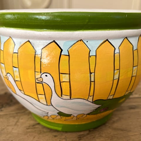 Meget pen blomsterpotte. Diameter ca 17 cm (innvendig ca 14), høyde ca 10 cm. Noe krakilert. Nyere produksjon. Passer til tre svibler. Kan sendes med postnord kr 69.