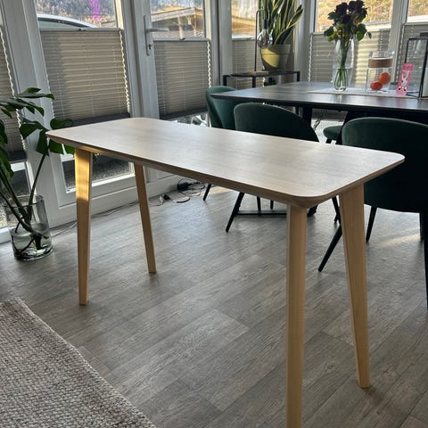 Unikt spisebord selges, kun ett av sitt slag. Pen eikeplate med riller i limskjøtene (se bilder). Bordplatemål: 165 cm langt og 90 bredt. Veldig stødig og solid. Stålkonstruksjon og bordplate er laget i samarbeid mellom Tom R. Larsen Interiør Design, og møbelsnekker Mats Dahlberg i M D Compagniet. Bordplate kan demonteres fra understellet, men understellet er sveiset i ett stykke og krever litt plass ved frakt.