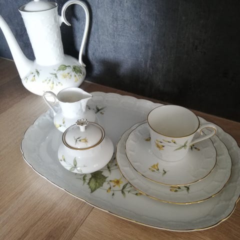 Selger et nydelig kaffeservise fra Regnbuen, Narumi Rosa Somnium ( Bone China ). Ingen slitasje eller skader. Selges samlet eller som deler. Settet består av kanne, vase, to lysestaker, fløtesett (to fløtemugger), 20 kopper med skål, 12 asjetter. Kan sendes om kjøper betaler frakt. Sender med ønsket fraktselskap fra kjøper.
