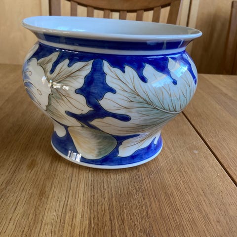 Potteskjuler/krukke er12 cm høy og har diameter18 cm.