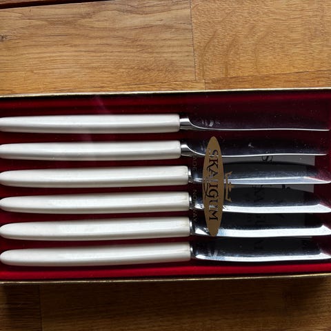 6 meget pene kniver fra engelske Cheffield. Rustfrie. Plastskaft. Lengde ca 23 cm. Pris samlet.