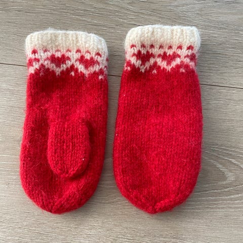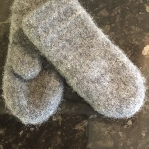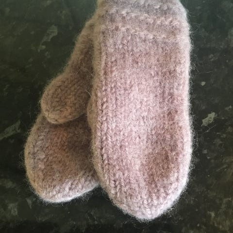 Hjemmestrikk. Tovet minions votter i ull. Passer str 1 år.