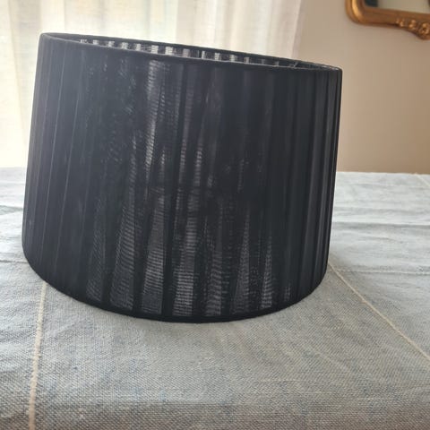 Stor plise gråblå lampeskjerm. Diameter oppe 23 cm, diameter nede 34 cm, høyde ca 31 cm.