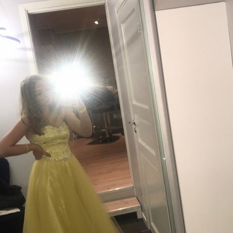 Ballkjolen kan prøves når det passer. Ballkjolen er fortsatt helt ny og ingen bruksmerker, ettersom det aldri ble noen anledning til å bruke den.