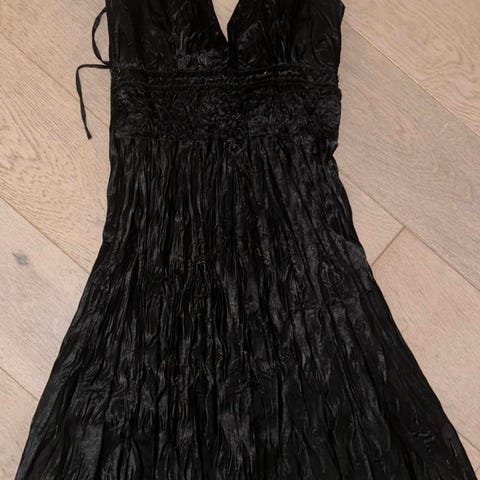 Kjole i fløyel og taft. Nyrenset. Bildene gjengir ikke korrekt farge, i virkeligheten fremstår kjolen i mørk plomme. A-linjeformet og halterneck, brukt kun én gang. Str 38. Kan sendes som Norgespakke på kjøpers regning.