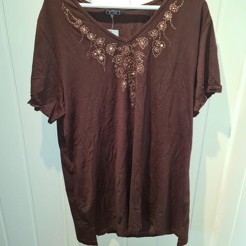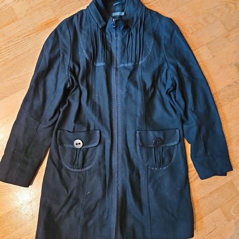 Str 48/50 strikke jakke fra Evita, svart med gull langs kanten. Henger litt på skrå, lommen skal henge litt lengere nede, kledelig på.