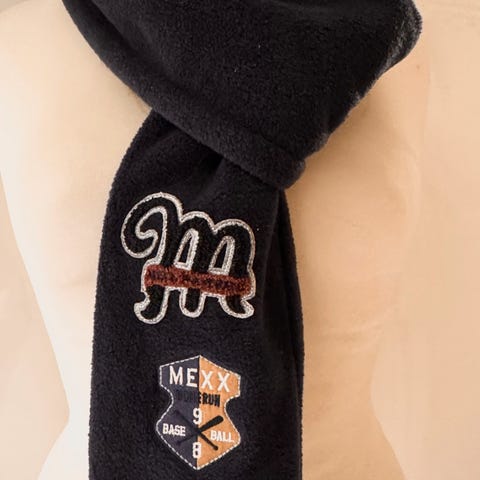 Ubrukt MEXX skjerf i 100% bomull - ca. 1,24 cm langt/19 cm bredt. Kan brukes på begge sider - fargerike striper på en side, og ensfarget rødt på den andre siden.