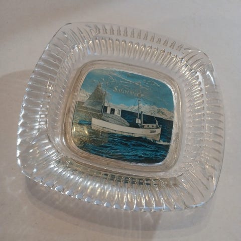 Metallfat i tinn med motiv av Stor-Elvdal hovedkirke + Flettet vase vintage style - fra 60 tallet