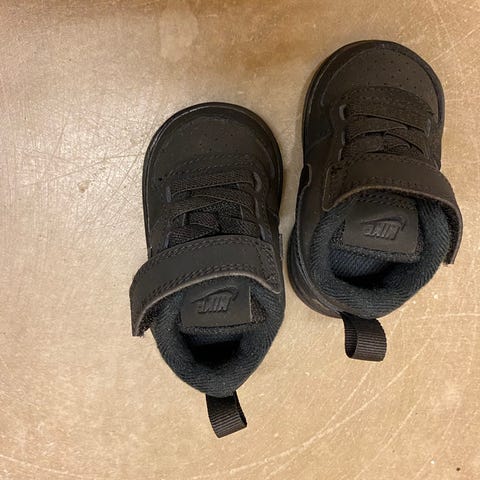 Nike baby sko i skinn str 17 som vi fikk i gave. De er ikke brukt og ble bare stående til pynt en stund, før de ble lagt bort.