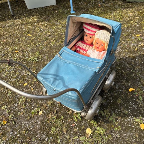 Gammel Simo dukkevogn fra 50-tallet.Er rust på skjermene og håndtaket,men ellers i god stand