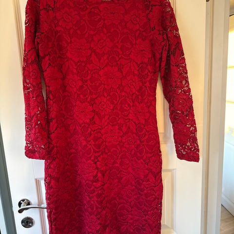 Helt ny kjole med blonder i nydelig rød fargen,kneelagt ,klasisk snitt .Litt elastisk.