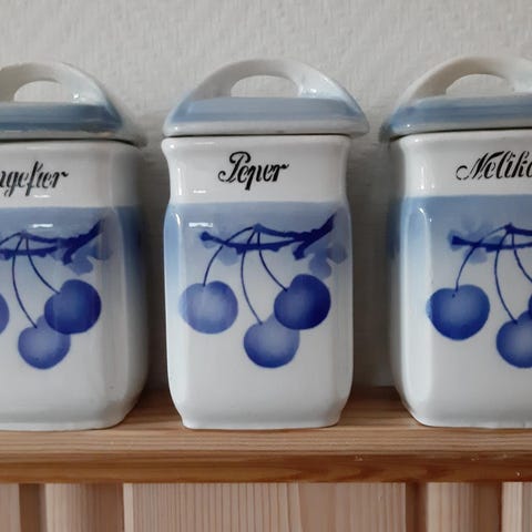 Tre og tre fra samme serie. De er alle i meget god stand vil jeg si. «Pepper « som er blå/ hvit har et lite nagg helt oppe på kanten og et underside av lokket ( se bildet ). Jeg tror alle er fra -30 tallet, dvs snart 100 år !!