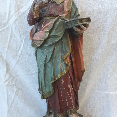 Apostelen Johannes er i gips. Skulpturen har enkelte skader - se hvite felt på bildet.