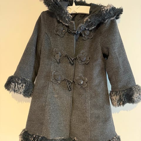 Svart kåpe til barn fra Lindex, str 104. Dobbel knappe rekke foran. Pent brukt.