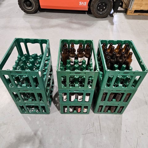 De grønne, blå og gule kassene kan stables oppå hverandre og er godt egnet til bruskassestabling.