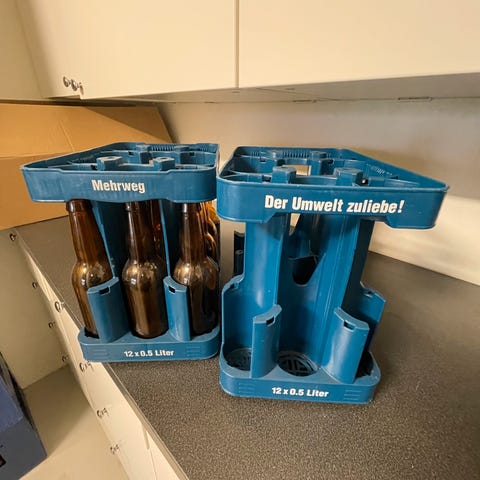 Har mange forskjellige kasser, også kasser for 0,5liters flasker.
