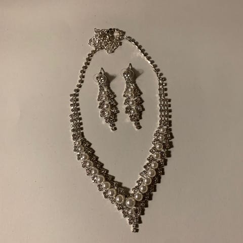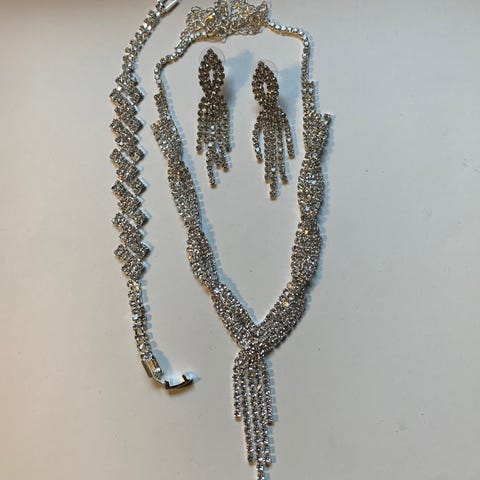 Nydelig kveldssmykkesett - halskjede, øredobber med skinnende steiner.