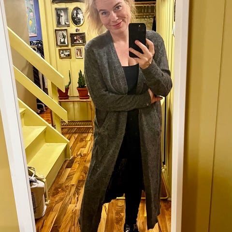Lang, deilig cardigan / jakke fra Creative Collective i mohair- og ullblanding: