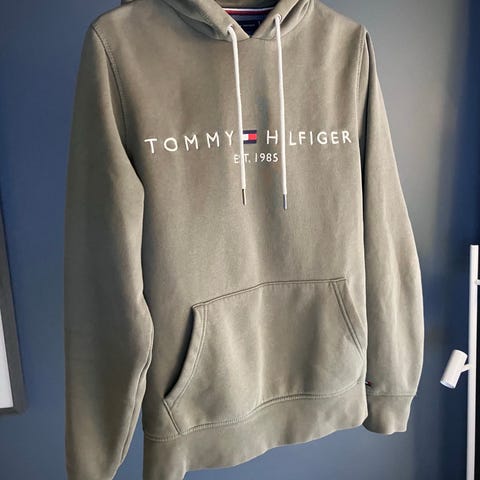 Lyseblå hettegenser med svarte og hvite detaljer. Hetta er svart inni.