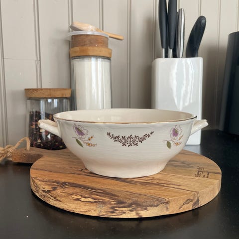Diameter er 9,5 cm, og høyde er 3,5 cm.