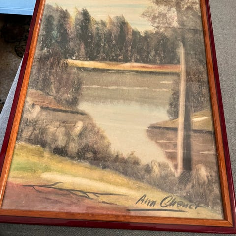 Flott maleri signert svenske Ann Chanet. Svært enkel håndterbar klikkramme i gull. Bittelitt fuktskader helt nederst på passepartoutet.
