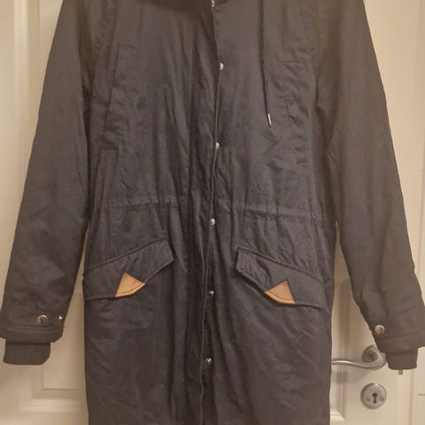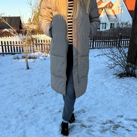 Mansjetter i ermene + knapper. Foret med glatt boblestoff. Strikk i livet og nederst.