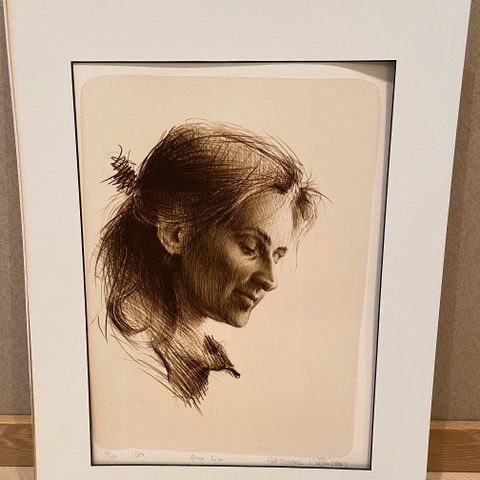 Signert litografi av Vebjørn Sand. Kostbar treramme gull maling belagt. Dobbelt passpatur. Selges 14tusen.