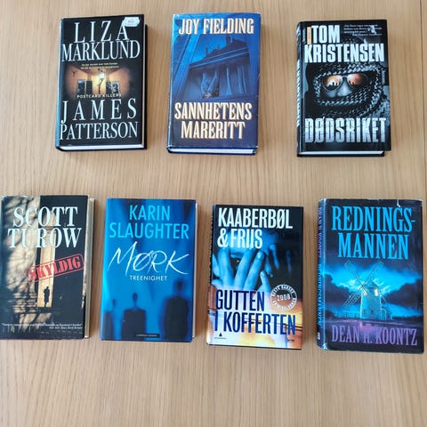 Selger en del forskjellige innbuene krimbøker og trillerbøker som er: