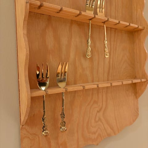 Håndlaget tallerken holder i tre til papp talerkner, størrelse ca. 19 cm. Kan stå eller henge på veggen.