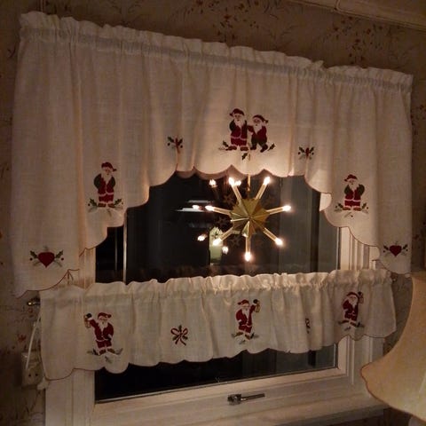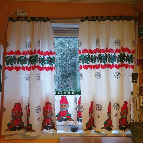 Fint juletreteppe med påsydd dekor. Nisser, juletre og pakker. Perfect Home. 120cm diam. 200,-Vattert og ingen flekker. Julestrømper i samme serie. 100,- pr stk.