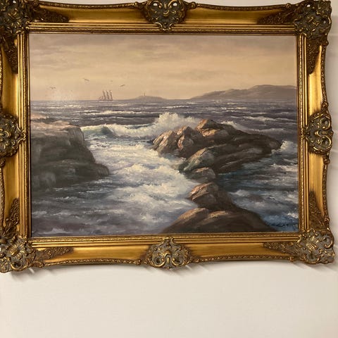 Oljemaleri på lerret. Fin og dyr ramme. Ligger utenfor blindrammen.