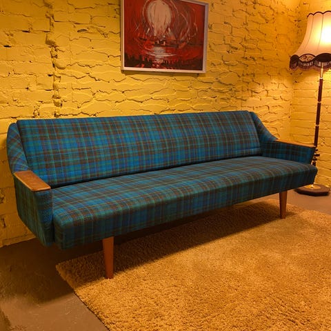 Nydelig, nett retro sofa i kul farge. Nyomtrukket!